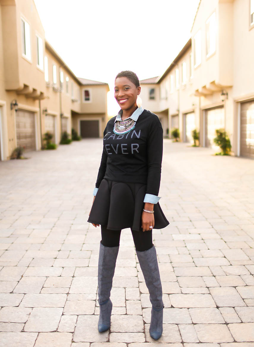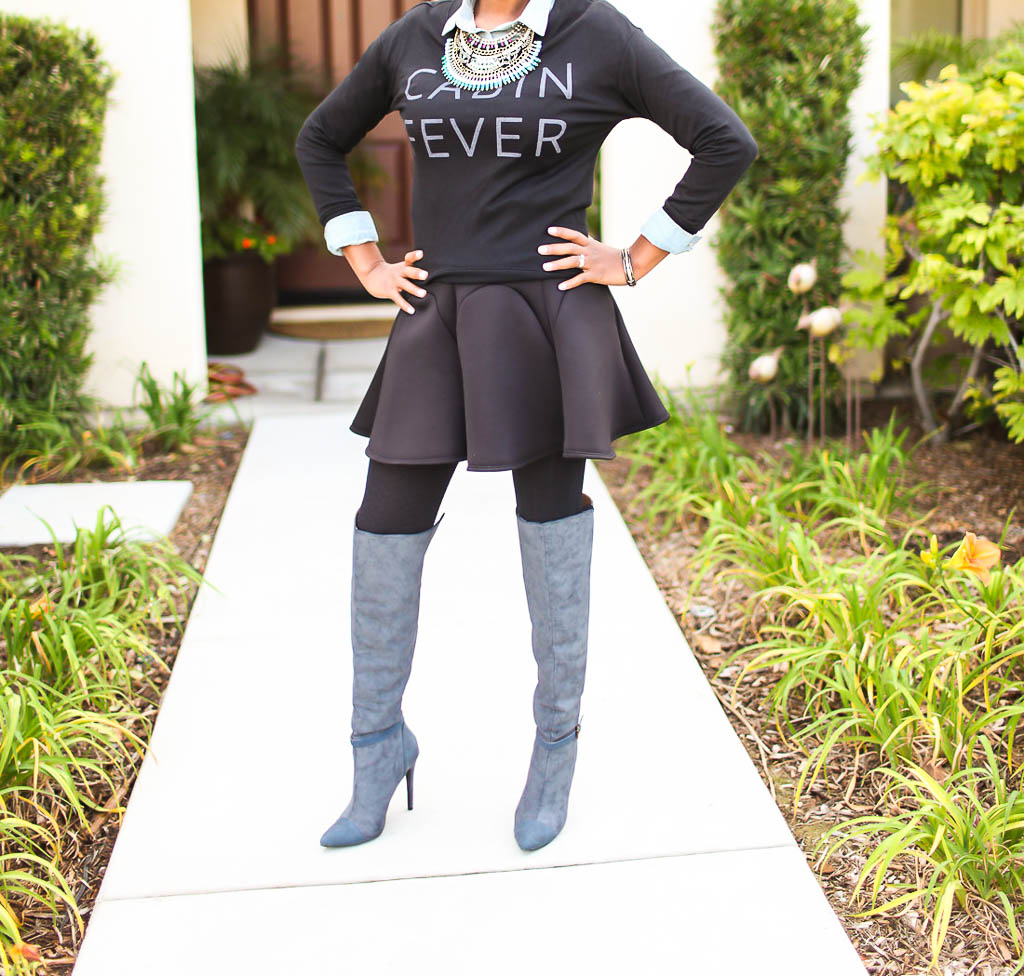 Today’s outfit is all about this scuba skater skirt. This scuba material is a synthetic rubber that’s often used to make wet suits, but has become popular as a clothing material. The fabric is very thick making the scuba material perfect addition to your winter wardrobe. I bought this black scuba skater skirt at Charlotte Russe for $9.99 on a clearance rack. If you don’t already make a bee line to the clearance sections of your favorite retail stores when you shop, then you are not truly capitalizing on savings.