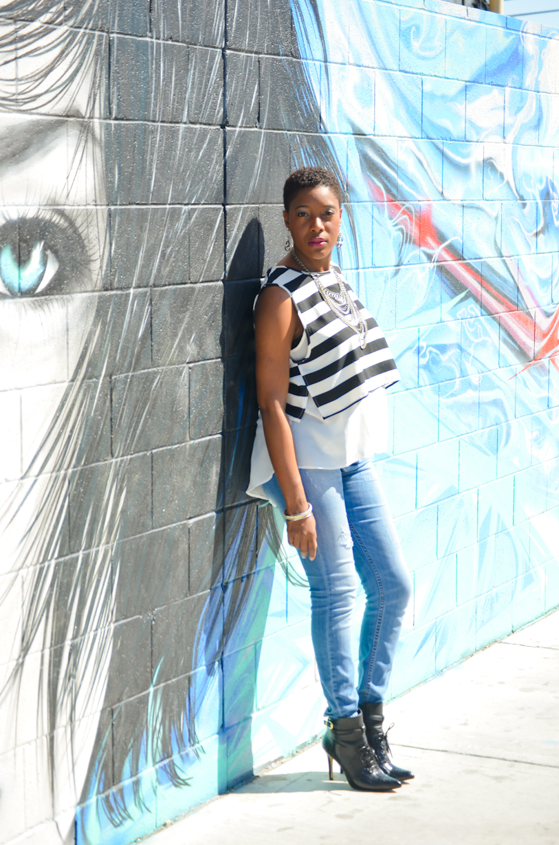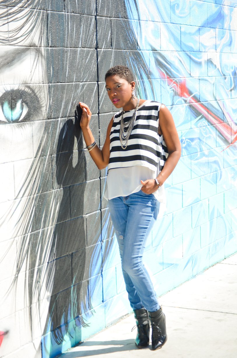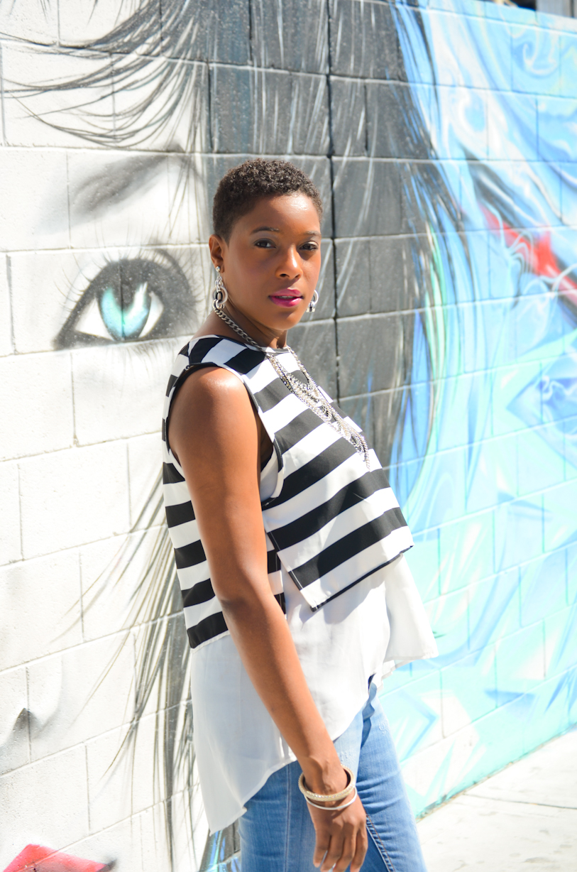 As for spring layering I choose two very light weight pieces. I thrifted this cropped black and white sleeveless shirt from Goodwill in San Diego for $4.50. The white semi sheer sleeveless high-low shirt underneath, was purchased from the Macys clearance rack for only $7.00. I consider this white shirt as a staple in my closet during the warmer weather when it comes to layering.